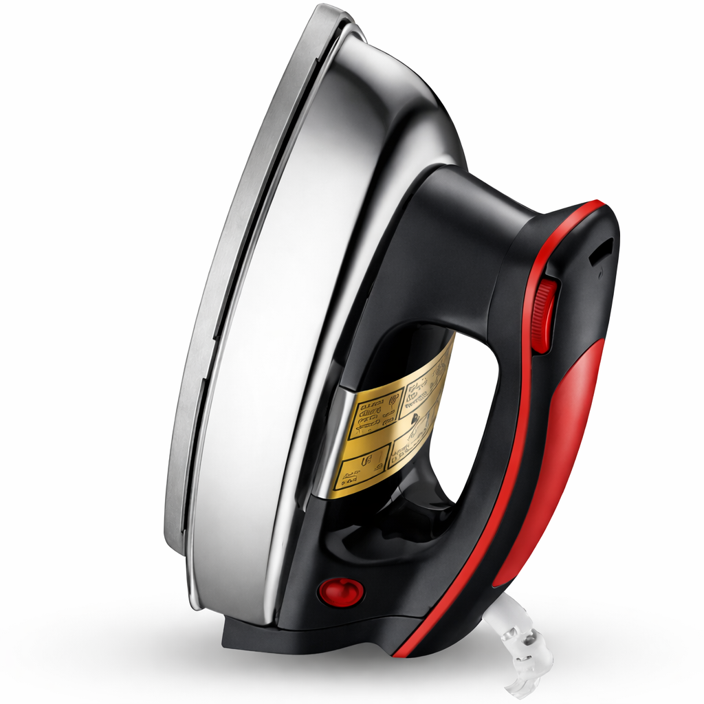 Experience powerful, smooth, and safe ironing with the Alqo Solar 1000W Heavy Plancha Dry Iron. Built with a premium 3-layer golden non-stick soleplate, it delivers 3x better durability and effortless glide on all fabrics. The instant quick-heat technology ensures fast heating, making ironing faster and more efficient—even for tough materials like denim and linen.