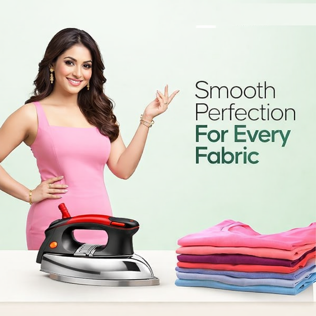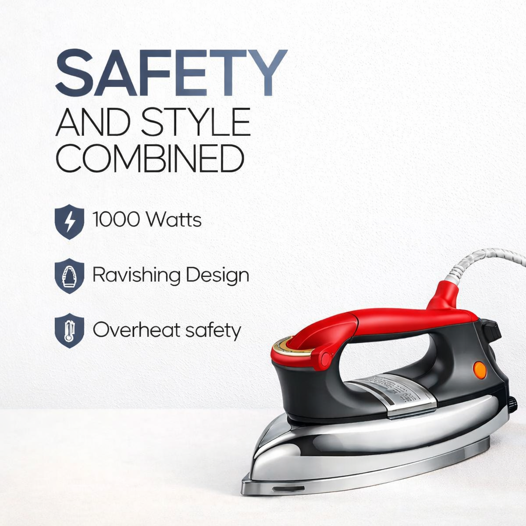 The ALQO Heavy Weight Dry Plancha Iron delivers efficient crease removal with 1000W power, heavyweight body & durable soleplate — ideal for household ironing.