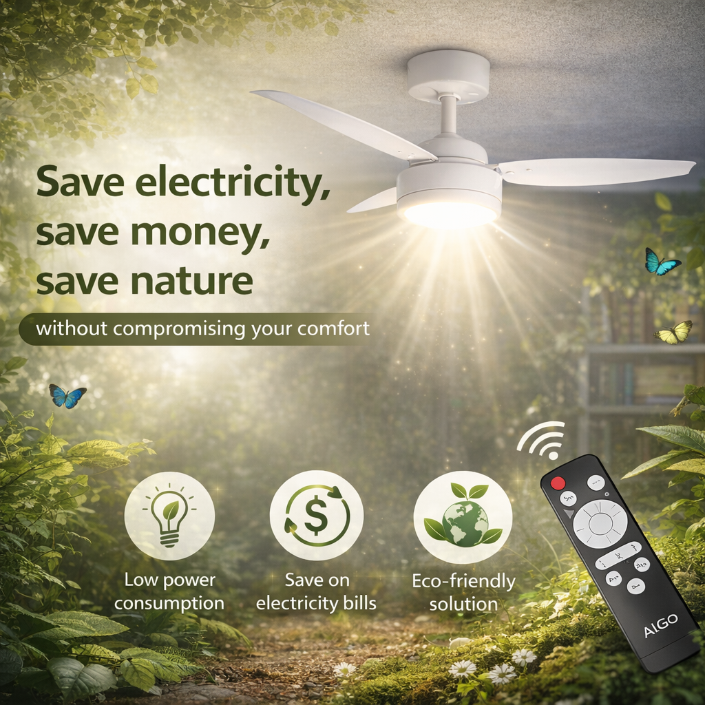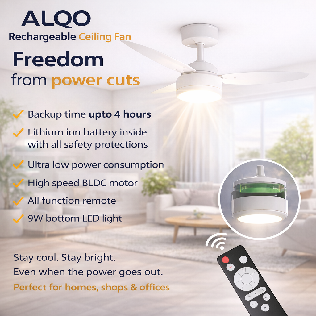 The ALQO Rechargeable Ceiling Fan is India’s first ceiling fan designed for Indian homes that need low electricity bills, silent operation, and power-cut backup. It combines BLDC technology with a built-in lithium-ion battery to deliver comfort even when electricity is unavailable.It eliminates the need for expensive and inefficient inverters, which cause higher power loss, extra electricity consumption, and double the financial burden during power cuts. With ALQO, you save energy, save money, and enjoy peace of mind—day and night.. It comes with smart remote and LED light indicator. Complete freedom from frequent power cuts. just plug and play. Inbuilt premium quality lithium-Ion rechargeable battery with BMS protections for safety and longer life. Battery automatically gets charged while fan is running on grid supply, it takes about 5 hrs to get fully charged. Short circuit protection and Low/High cutoff protections provided in the battery for your safety. Automatically switch between grid and battery. High Speed BLDC motor for wider air delivery.